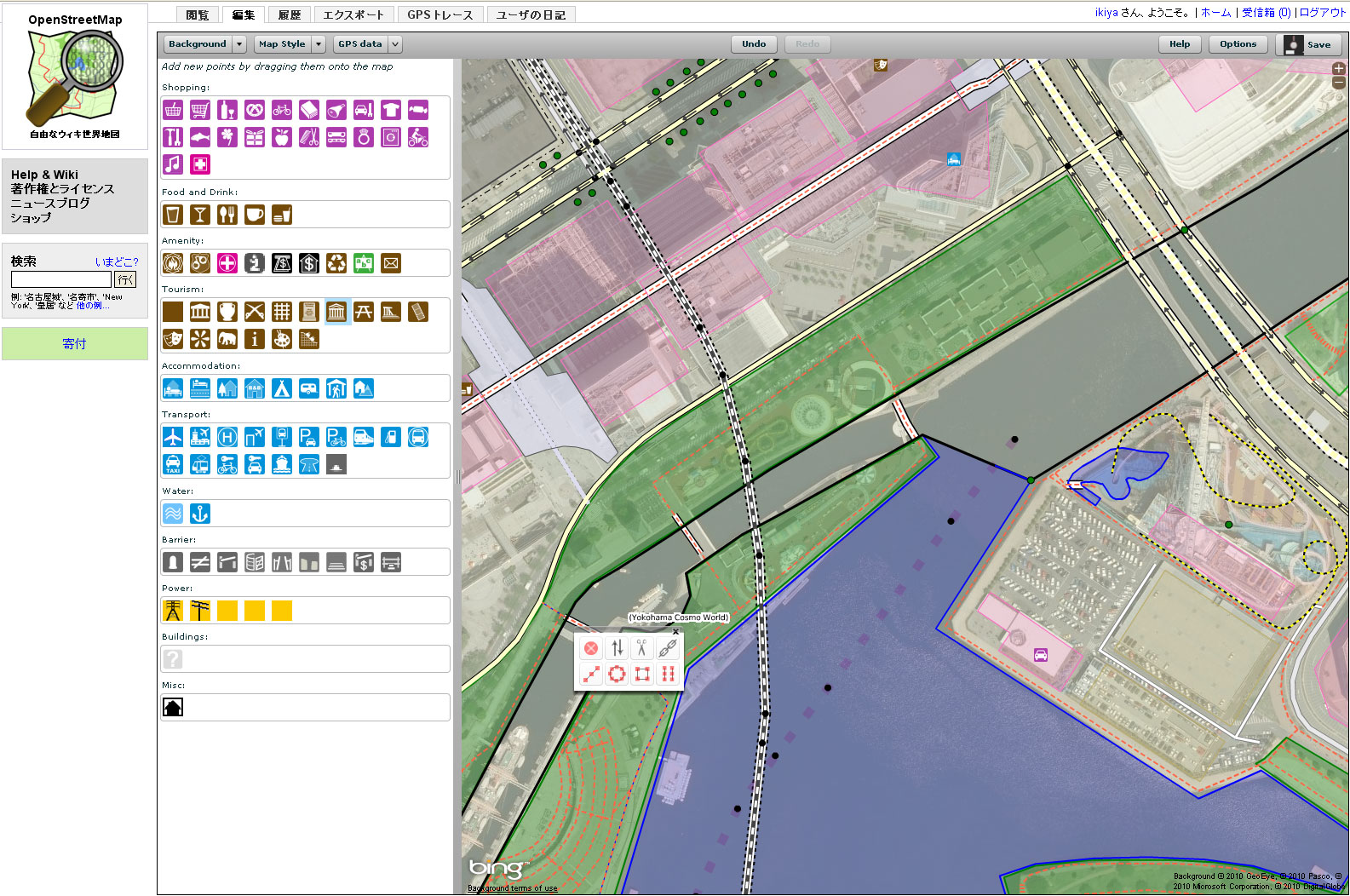 >> Potlatch 2で背景をBing設定して利用可能です。